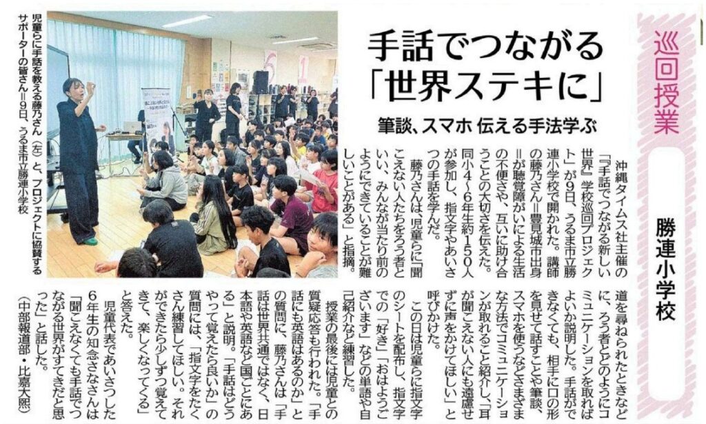沖縄タイムス社さんとの共同企画「学校巡回授業『手話でつながる新しい世界』」の様子が、